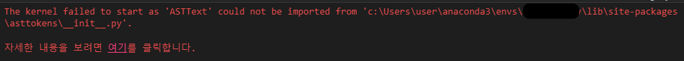 Python 공부를 하면서 필요한 패키지들을 다운로드 받고 실행을 하다가 어느 순간부터인가 Jupyter notebook을 실행시 Kernel failed Error 가 발생하기 시작했다. 1. "여기"를 클릭한 결과 Failure to start kernel due to failures in importing modules from files · microsoft/vscode-jupyter Wiki · GitHub Failure to start kernel due to failures in importing modules from files VS Code Jupyter extension. Contribute to microsoft/vscode-jupyter development by creating a..